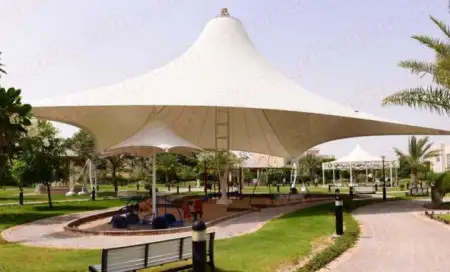 Struktur membrane melindungi dari terik matahari, menciptakan ruang teduh, dan tahan lama di area outdoor.